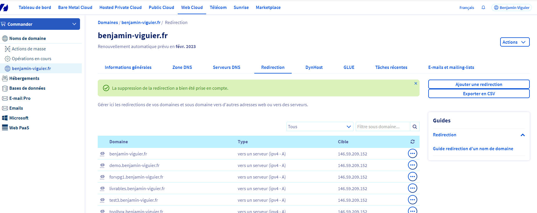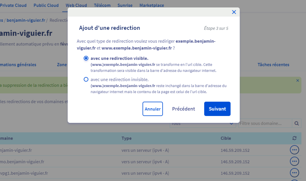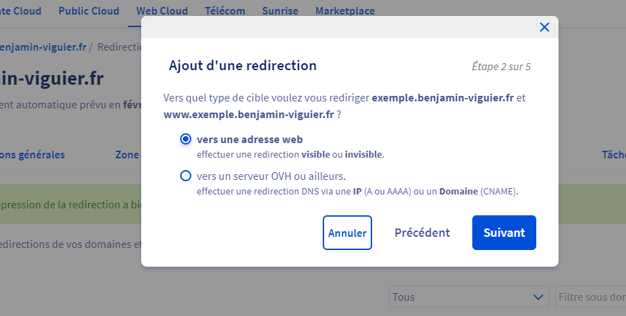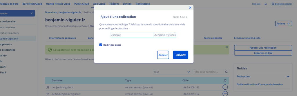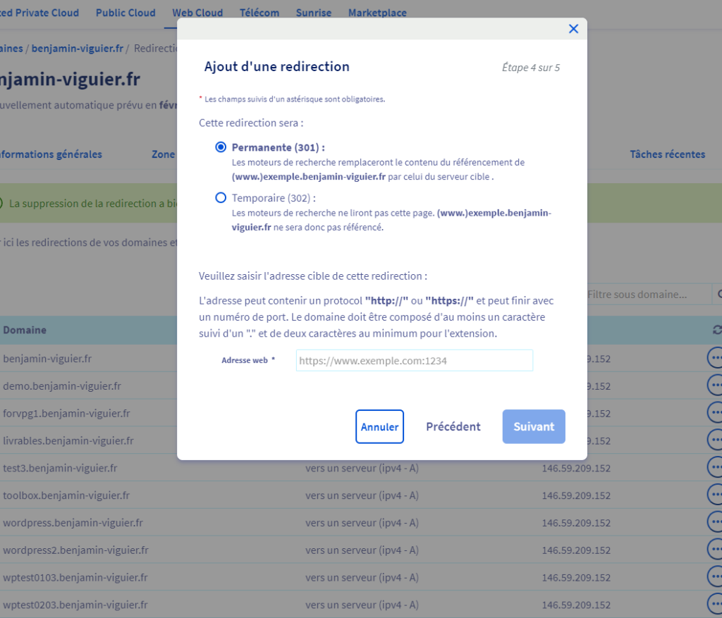 Nom de domaine-> Redirection -> Ajouter une redirection