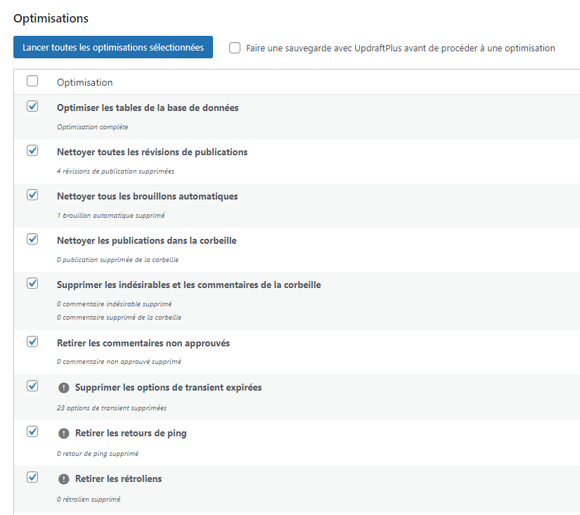 Créer une sauvegarde UpDraftPlus si besoin (risque faible mais existant)