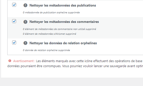 Vous êtes désormais en mesure de nettoyer la table wp_postmeta permettant de réduire la taille de votre base de données Mysql. Ce qui vous permettera de supprimer les données inutiles de votre base de donnée et ainsi reduire la taille de celle-ci. N’hésitez pas à prendre contact avec notre service technique, via un ticket d’incidence pour toutes questions.