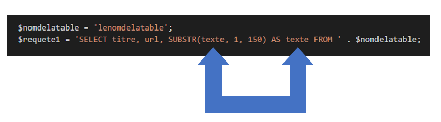 $requete1 = 'SELECT titre, url, SUBSTR(texte, 1, 150) AS texte FROM ' . $nomdelatable;
