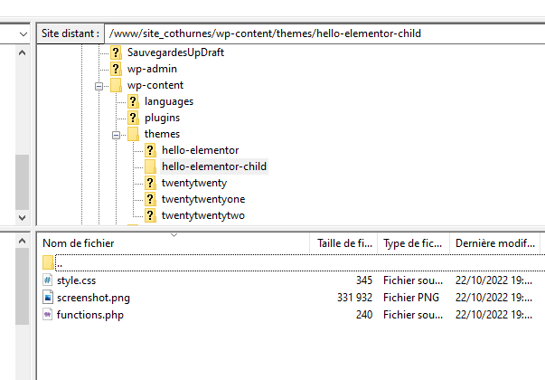 - Répertoire créé dans wp-content, et porte le nom du thème principal, suivi de « -child »